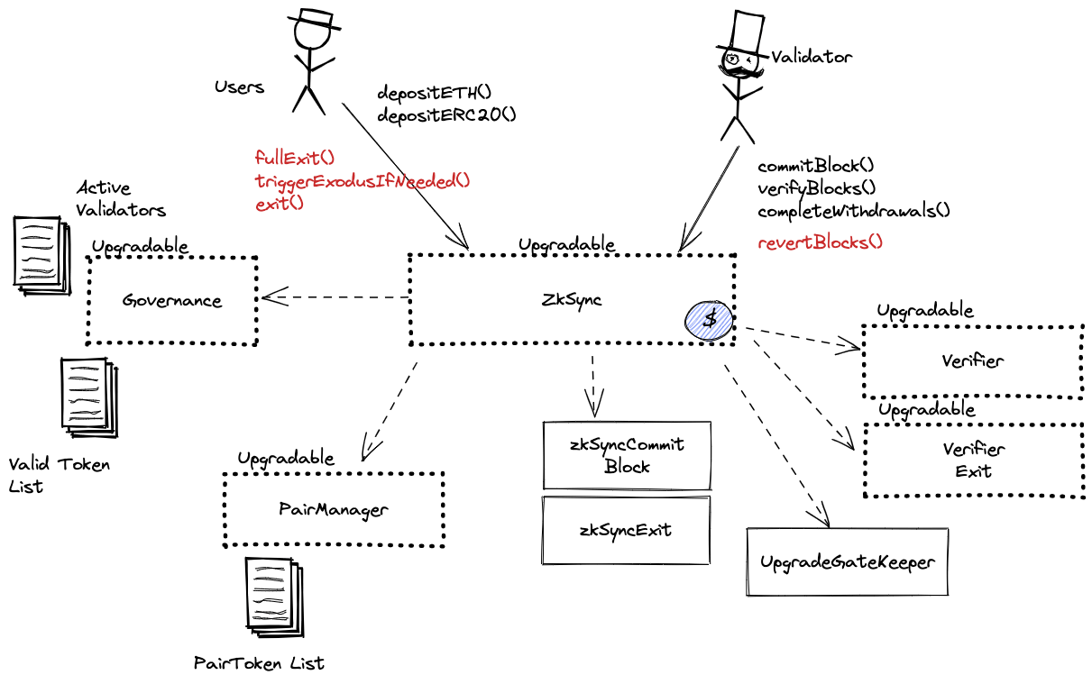 The main Rollup contract. Operator commits blocks, provides ZK proof which is validated by the Verifier contract and process withdrawals (executes blocks). Users deposit ETH and ERC20 tokens. This contract defines the upgrade delay in the UPGRADE_NOTICE_PERIOD constant that is currently set to 8 days.